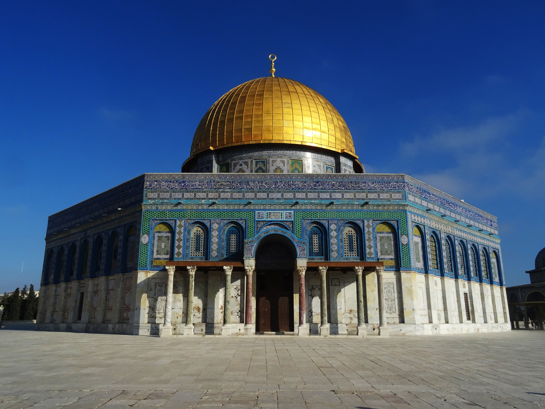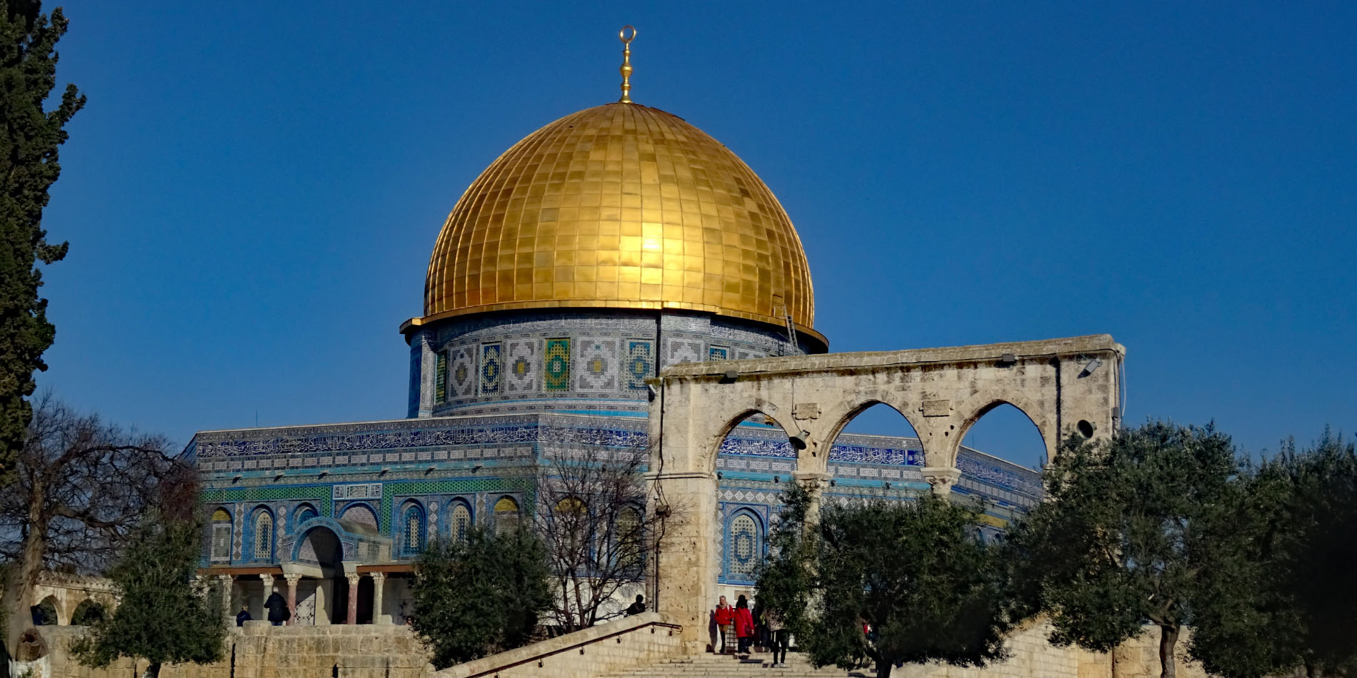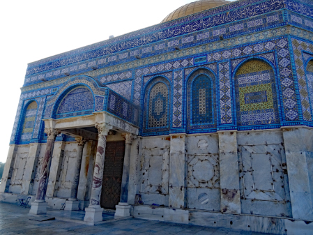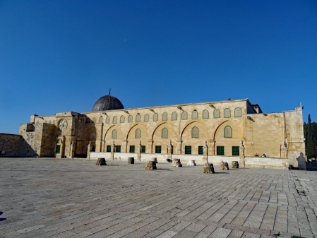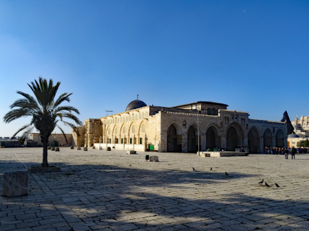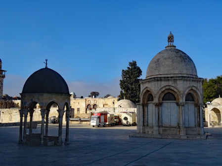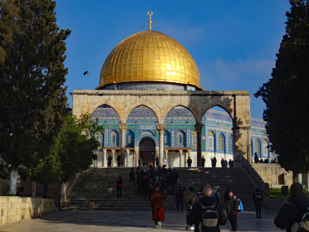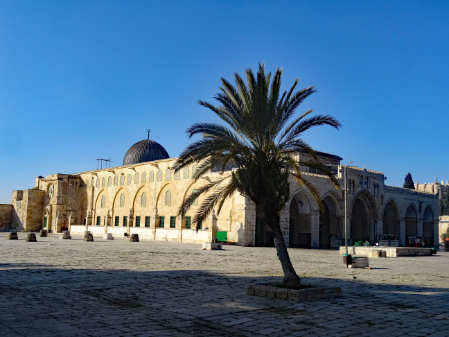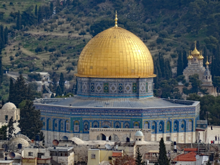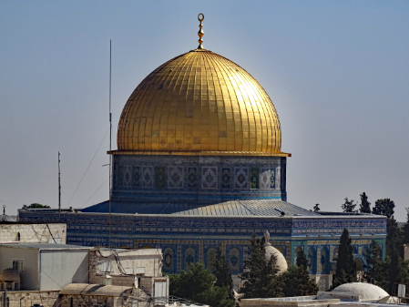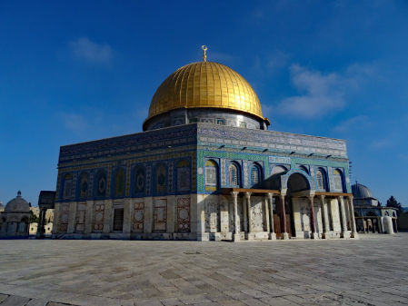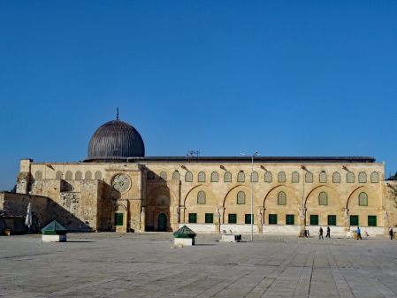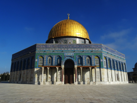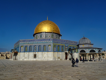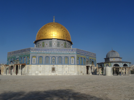 Im ersten Jahrhundert der islamischen Herrschaft wurde Jerusalem von der Dynastie der Umayyaden kontrolliert, die seit 639 die islamischen Statthalter Syriens stellte und in den Wirren nach dem Tod des ersten umayyadischen Kalifen Uthman mit dem 660 in Damaskus proklamierten Kalifen Muawiya das erbliche Kalifat begründete. Muawiya verlegte die Kalifenresidenz in die syrische Hauptstadt Damaskus. Unter seinen Nachfolgern aus der umayyadischen Seitenlinie der Marwaniden verlagerte sich der Schwerpunkt des Umayyadenreiches um 680 endgültig nach Syrien und Palästina. Unter ihrer Ägide entstanden die wichtigsten islamischen Sakralbauten in Jerusalem. Auf dem Tempelberg ließ Kalif Abd al-Malik um 692 den Felsendom fertigstellen und anstelle eines unmittelbar nach der Eroberung entstandenen hölzernen Vorgängerbaus die unter seinem Sohn vollendete al-Aqsa-Moschee erbauen. Durch die Verknüpfung des Felsendoms mit der Legende von der Himmelfahrt Mohammeds erhielt Jerusalem in dieser Zeit auch für die Muslime eine besondere religiöse Bedeutung. Es gibt auch Anhaltspunkte dafür, dass in der Zeit al-Maliks islamische Riten an dem Felsen vollzogen wurden, die ansonsten nur an der Kaaba in Mekka stattfinden.