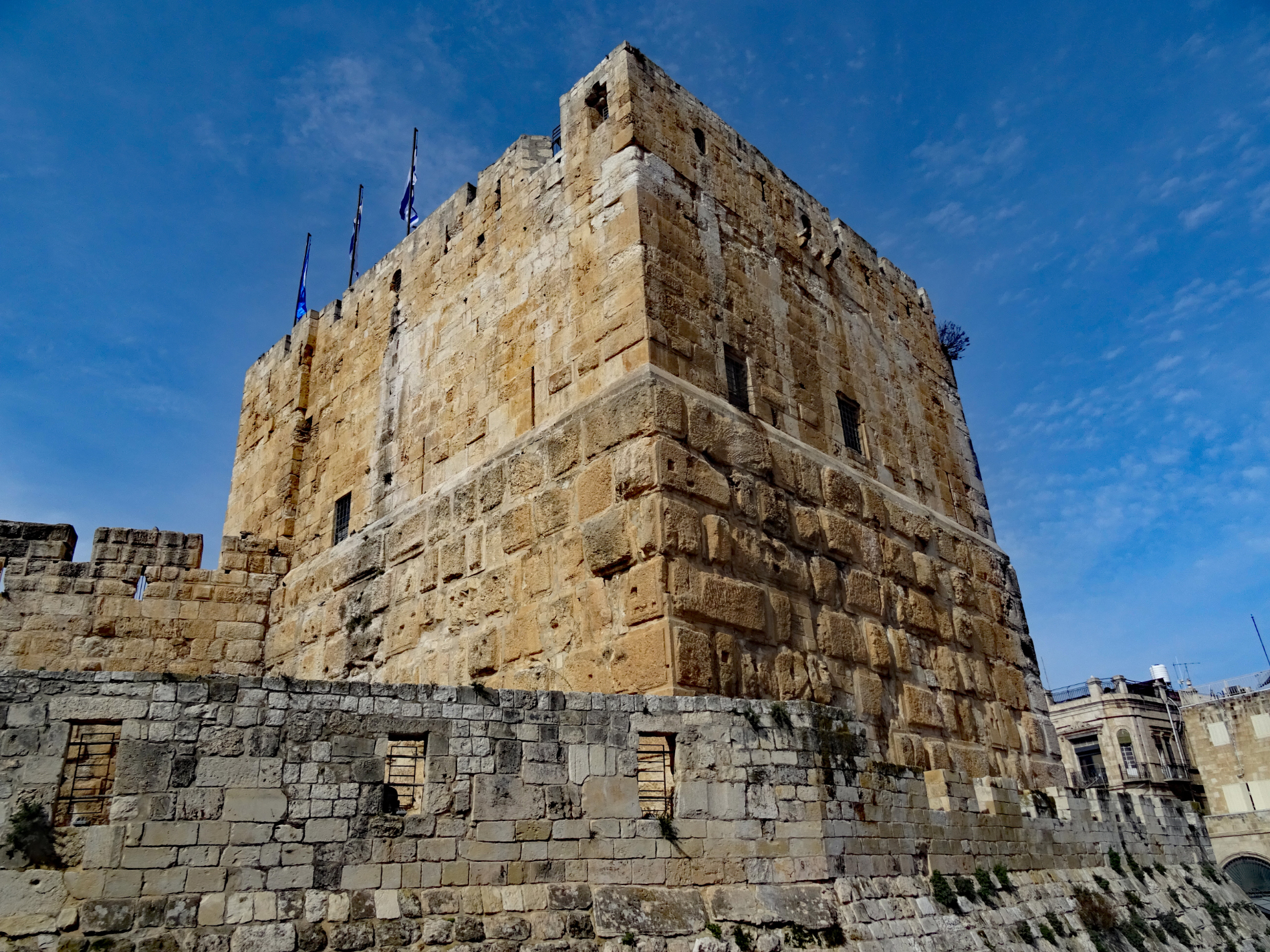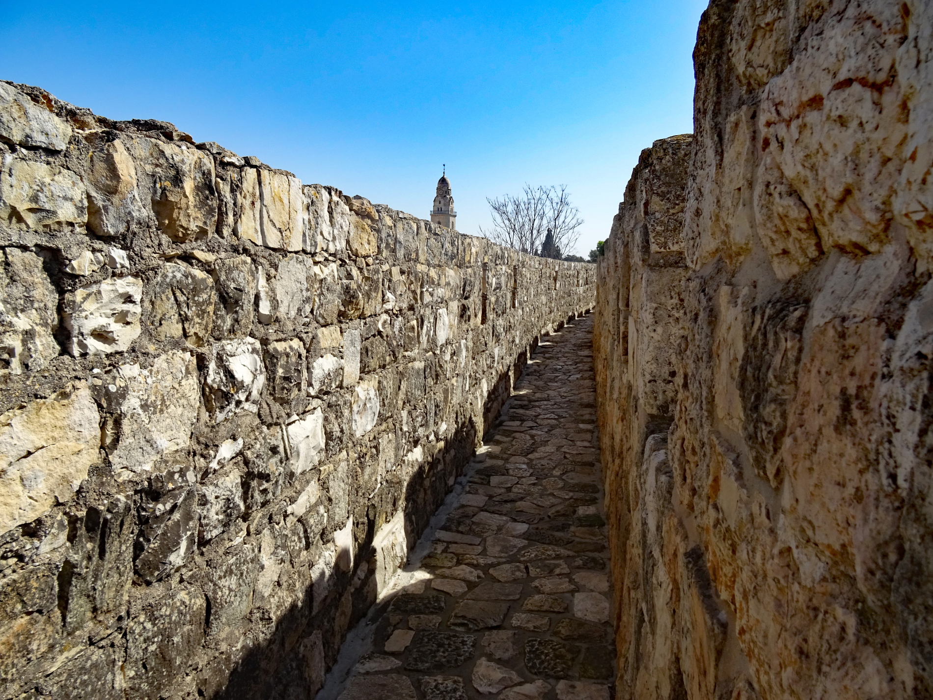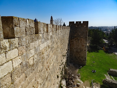 Nach der vernichtenden Niederlage der christlichen Ritter in der Schlacht bei Hattin im Jahre 1187 gelang es Saladin, der die Fatimiden gestürzt und als Sultan von Ägypten die Herrschaft der Dynastie der Ayyubiden in Ägypten, Palästina und Syrien begründet hatte, Jerusalem nach kurzer Belagerung zu erobern. Nach der Einnahme der Stadt ließ er das von den Kreuzfahrern errichtete goldene Kreuz auf der Kuppel des Felsendoms und die Marmorverkleidung des Felsens samt Altar entfernen. Im Verlauf des dritten Kreuzzuges plante der englische König Richard Löwenherz nach seinem Erfolg bei der Belagerung von Akkon (1189-1191) und der Wiederbesetzung der meisten Küstenstädte auch die Rückeroberung Jerusalems, führte den Feldzug aber wegen militärischer Aussichtslosigkeit nicht mehr aus. Hauptstadt des Königreiches Jerusalem war von nun an Akkon. Während des Kreuzzugs von Damiette in Ägypten ließ der ayyubidische Herrscher von Syrien al-Mu'azzam im Frühjahr 1219 die Stadtbefestigungen von Jerusalem bis auf den Davidsturm niederreißen und die umliegenden Burgen schleifen, weil man eine Übergabe an die Kreuzfahrer befürchtete und ihnen keine verteidigungsfähige Stadt überlassen wollte. Von da an bis zum Bau der neuzeitlichen Stadtmauer unter den Osmanen (1537-40) blieb Jerusalem für ca. 300 Jahre unbefestigt.